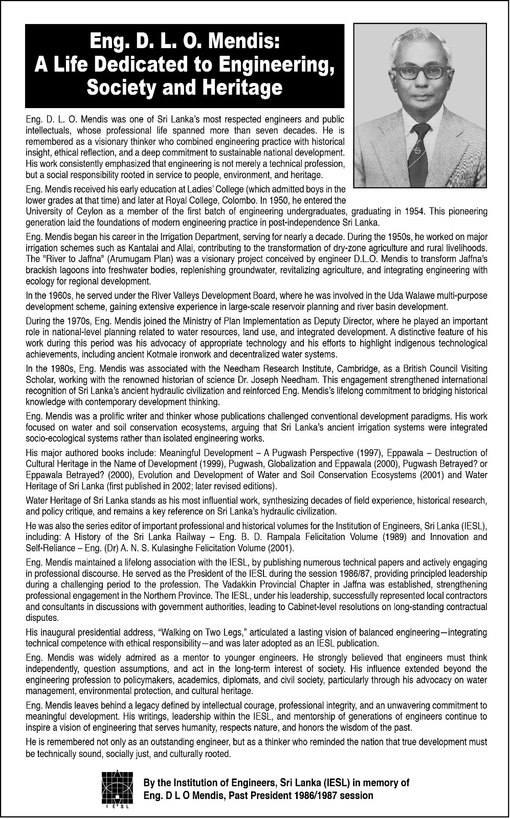 Eng. D. L. O. Mendis is remembered not only for his technical expertise, but also for his belief that engineering should serve society, protect the environment, and respect our cultural heritage.