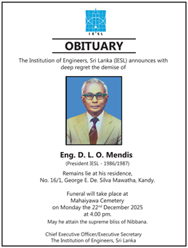 Eng. D. L. O. Mendis was a distinguished Sri Lankan engineer and a Past President of the IESL, serving in the year 1987. He made an outstanding contribution to the engineering profession and to the development of our country.